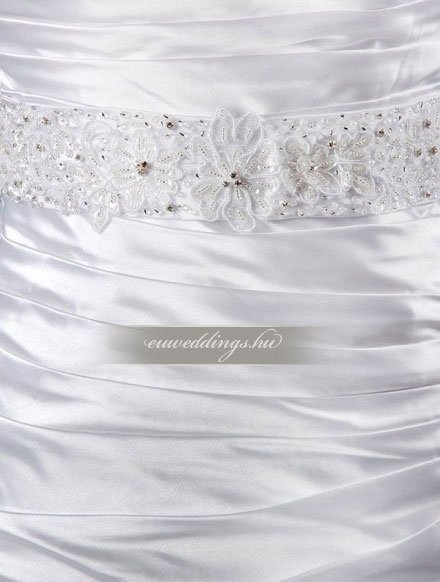 Selyemszatén, elegáns menyasszonyi ruha, egyenes dekoltázzsal, szabályos hajtásokkal. Az öv rögzített a fűzőnél, gyöngyökkel díszített. Az uszályos szoknya aszimmetrikus hajtásokkal és felhúzásokkal díszített.