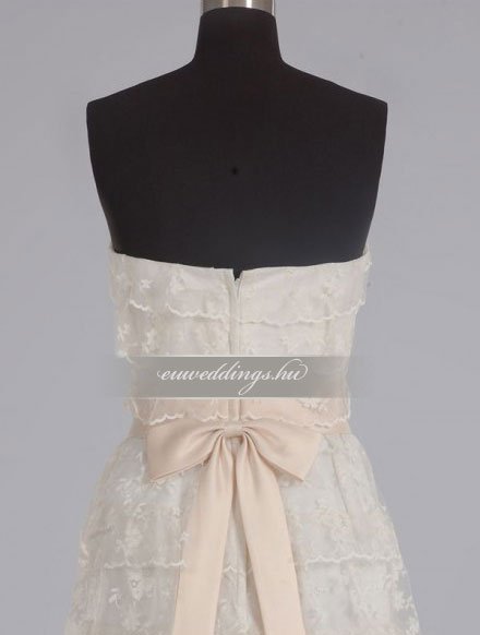 Csipkés, fodros esküvői ruha, elefántcsontszínben. A teljes ruhát könnyed, csipke fodrok díszítik, a ruha romantikus hangulata és a sok csipke miatt remek választás lehet egy vintage hangulatú esküvőre is. Az öv selyemszatén és bármilyen színben rendelhet